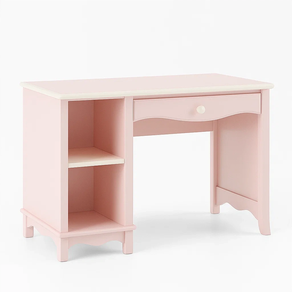 Scrivania per bambini in legno rosa con cassetto e ripiani