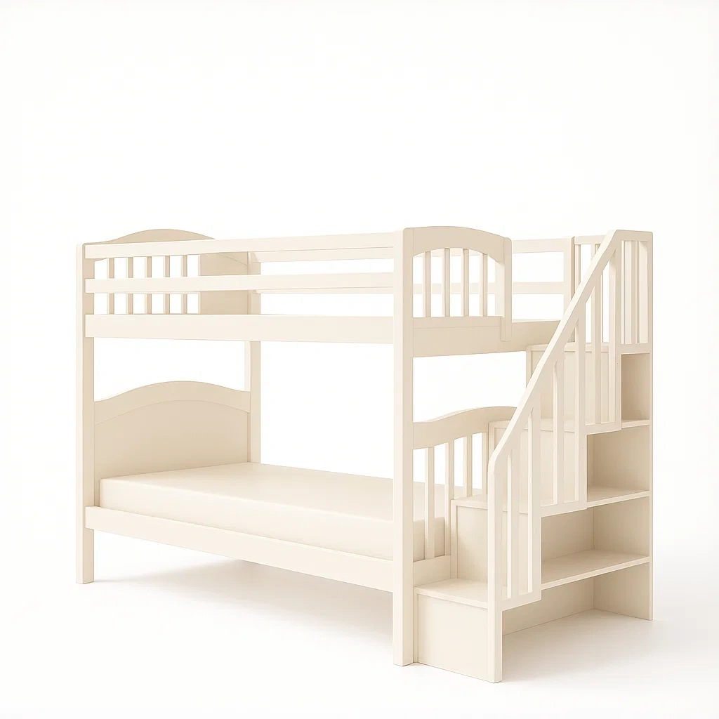 Il letto comprende una struttura a castello con letto superiore e inferiore, oltre a una scala laterale con gradini contenitore integrati.