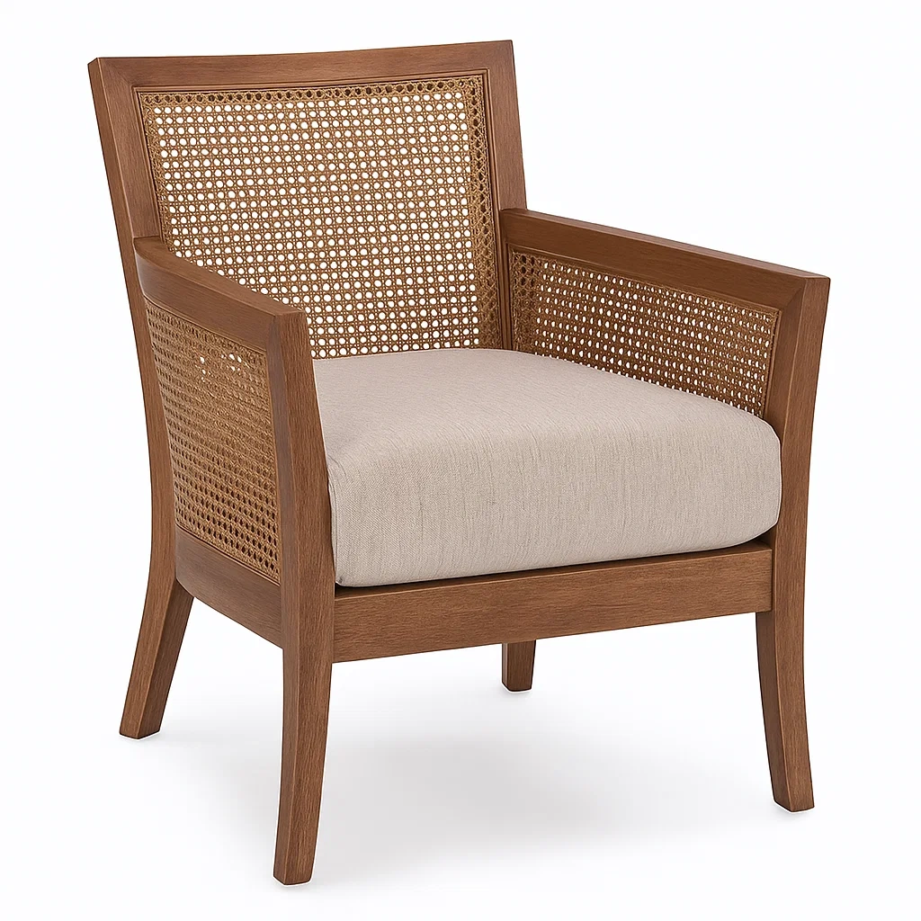 Materiali: Struttura in legno di noce, schienale e braccioli in vimini naturale, seduta imbottita in poliuretano con rivestimento in tessuto di cotone beige